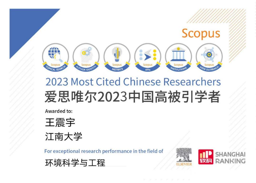 近日,国内全球学者库网站公布了“2023全球学者学术影响力排名(终身学术影响力榜)”。在环境科学与工程领域,全球共有1880名学者入围,中国学者占481人。江南大学环境与生态学院王震宇教授继2022年后再度入选该榜单,标志着我校环境学科科研水平和国际影响力正持续提升