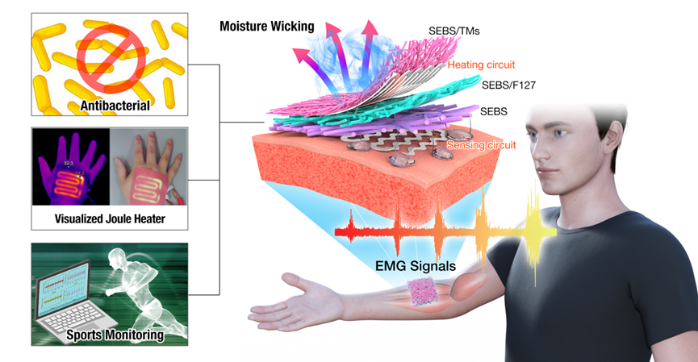 具有类皮肤模量、高弹性和多功能集成(包括穿戴舒适性、抗菌性能、防护性能、智能响应性能、人体生理信号的检测性能等)的可穿戴表皮电子器件,在医疗设备、可穿戴电子和人机交互领域有着巨大的应用前景。影响人体舒适度的因素很多,而热湿舒适性是最基本也是最重要因素之一。然而,传统的薄膜基柔性电子器件常采用单层的不透气材料为基底,严重限制了皮肤器件的佩戴舒适性和多功能集成性。