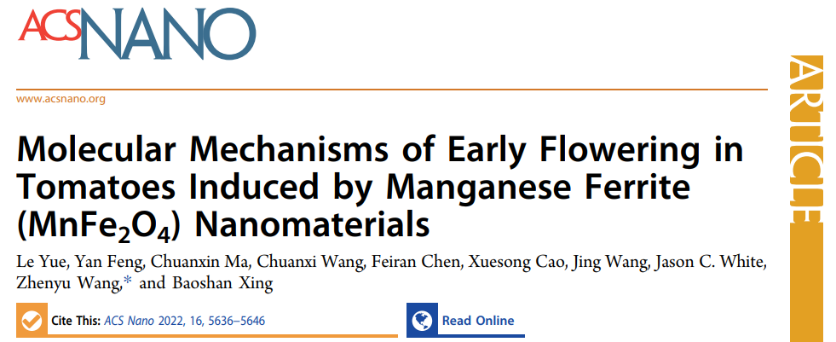 2022年4月,乐乐副研究员以第一作者在ACS Nano发表论文:“Molecular Mechanisms of Early Flowering in Tomatoes Induced by Manganese Ferrite (MnFe2O4) Nanomaterials”,王震宇教授为通讯作者。