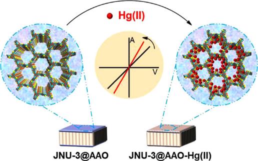 因此在本工作中,制备了2D硫脲COF功能化AAO传感器用于环境样品中汞的快速精准检测。2D硫脲COF高度有序的结构可有效提高所制备传感器与汞(Hg)的传质效率,硫脲基团对Hg(II)的强特异性亲和力可有效提高所制备传感器的选择性。发展室温常压法合成2D硫脲COF(JNU-3),通过原为生长法将其键合于AAO外表面,优化单体浓度制备重现性良好的JNU-3功能化的AAO传感器(JNU-3@AAO),所制备的传感器实现了Hg(II)的超快和精确的测定(90 s),低检测限(3.28 fg mL-1),宽线性范围(0.01−100 pg mL-1),为环境和食品样品中Hg的灵敏且快速检测提供新的思路,为纳米通道技术用于快速检测提供新的契机。