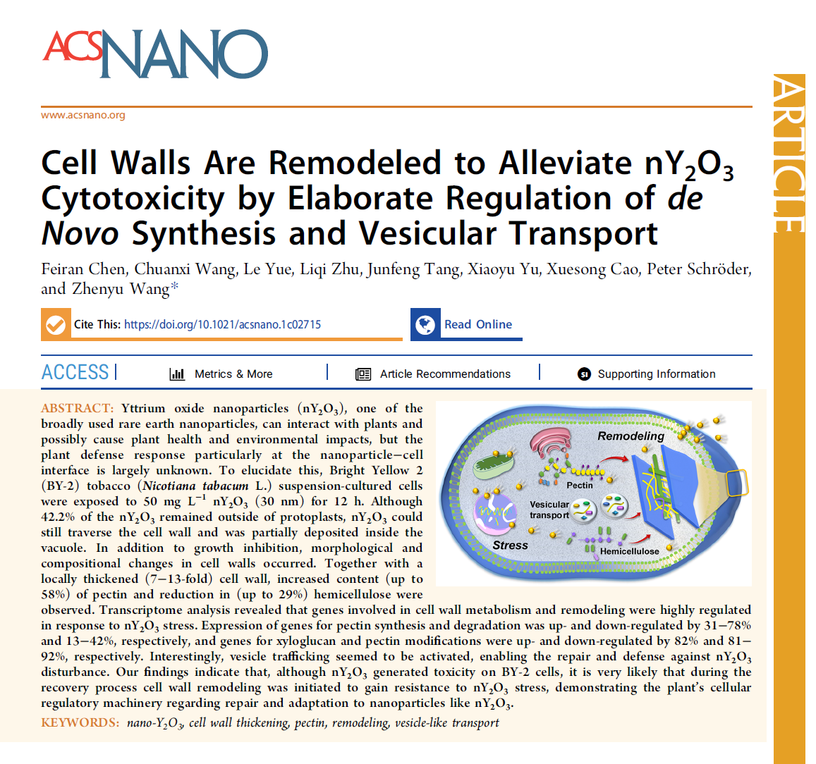 2021年8月,陈菲然副教授以第一作者在ACS Nano发表论文:“Cell Walls Are Remodeled to Alleviate nY2O3 Cytotoxicity by Elaborate Regulation of de Novo Synthesis and Vesicular Transport”,王震宇教授为通讯作者。