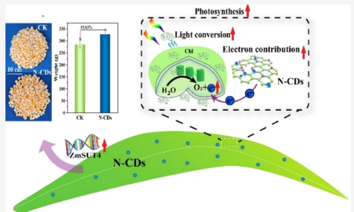 荧光碳点 (CDs) 是一种人造天线,可放大光收集能力并增强植物光合作用。然而,这种促进作用的主要机制和 CDs 结构贡献尚不清楚。与对照相比,具有蓝色荧光的CDs和氮(N)掺杂CDs(N-CDs)在50 mg·L-1或更低的施用浓度下可促进玉米生长。玉米叶喷N-CDs(5 mg·L−1)可提高净光合速率(21.51%)、碳水化合物含量(地下66.43%、地上42.03%)、鲜重(地下24.03%、地上34.56%)和干重(地下为72.30%,地上为55.75%),远高于CDs。主成分分析和密度泛函理论计算表明,与未掺杂的CDs相比,N掺杂通过改变CDs的结构来增强光转换和电子供应,使N-CDs成为有效的光转换材料和电子供体,以提高光电子转移速率。叶喷N-CDs最终提高产量和千粒重(24.50%和15.03%)。因此,N-CDs的应用可能是提高农业产量的一种有效方法。