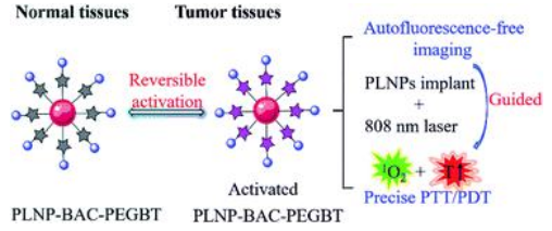 鉴于此,本工作发展了改进的表面活性剂辅助水热-低温煅烧方法,成功制备了近红外发射、粒径小、单分散、余辉时间长的长余辉纳米粒子。同时设计合成了肿瘤弱酸性微环境响应型不对称菁类近红外光热/光动力一体化试剂。将所得长余辉纳米粒子与光热/光动力一体化试剂有机融合,进一步修饰生物素功能化的聚乙二醇以增加复合材料的生物相容性及肿瘤靶向性,成功制得了基于长余辉发光激发的肿瘤靶向可激活型光热/光动力诊疗系统。肿瘤弱酸性微环境特异性激活的光热/光动力协同疗效、无自荧光近红外成像引导、免外光源连续照射结合生物素介导的肿瘤主动靶向特性赋予了该诊疗体系良好的肿瘤靶向成像性能和精准的治疗效果。本研究为智能诊疗平台的构建提供了新策略。