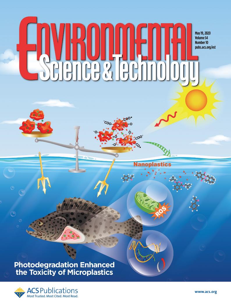 2020年6月,王震宇教授和Baoshan Xing教授以共同通讯作者在Environmental Science & Technology 发表封面文章: “Photodegradation Elevated the Toxicity of Polystyrene Microplastics to Grouper (Epinephelus moara) through Disrupting Hepatic Lipid Homeostasis”。文章首次研究了微塑料光降解对海洋鱼类肝毒性的调节机制,为微塑料在海洋环境中光降解后的潜在危害提供了新思路。