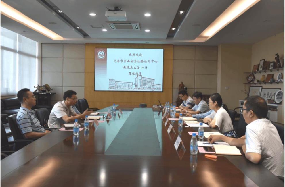 2020年8月21号,无锡市食品安全检验检测中心主任黄晓东、副主任冯永巍、副主任周宇一行来访研究所,江南大学地方服务和合作办公室副主任王恒、环境分析研究组组长严秀平教授和食品学院分析食品安全学研究所沈晓芳教授等人参加了会谈。