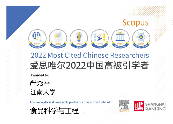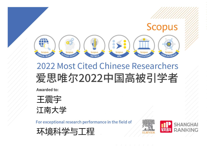 2023年3月28日,爱思唯尔(Elsevier)正式发布2022“中国高被引学者”(Chinese Most Cited Researchers)榜单,本次榜单共有5216位学者入选。其中江南大学共有23人入选,位列全国高校47名。环境过程与污染控制研究所的王震宇、严秀平、刘天西教授继入选2022年科睿唯安全球“高被引科学家”和爱思唯尔2021年“中国高被引学者”名录之后,再次入选2022年“中国高被引学者”榜单。连续入选高被引学者榜单也标志着研究所在环境交叉领域的研究水平和科研影响力逐年提升。