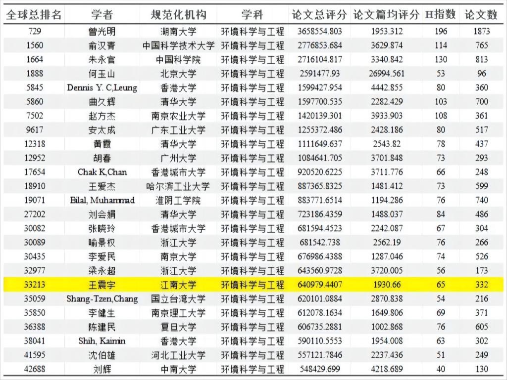 近日,国内全球学者库网站公布了“2023全球学者学术影响力排名(终身学术影响力榜)”。在环境科学与工程领域,全球共有1880名学者入围,中国学者占481人。江南大学环境与生态学院王震宇教授继2022年后再度入选该榜单,标志着我校环境学科科研水平和国际影响力正持续提升。